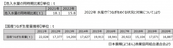 最盛期には約4万tあった国産の養殖うなぎ生産量は、ここ数年2万t前後で推移しています。また、水産庁が発表している「うなぎをめぐる状況と対策について」によると、今年は国内の養殖池へのシラスウナギ(うなぎの稚魚)の投入量が昨年より2.3t(成長した出荷量で約2800t相当)減少していることが確認されています。そのためうなぎの供給量が足りず、仕入れ価格が高騰しています。