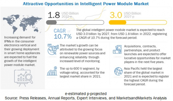 Intelligent Power Module Market by Voltage Rating (Up to 600 V, 601-1,200 V, Above 1,200 V), Current Rating, Circuit Configuration (6-Pack, 7-Pack), Power Devices (IGBT, MOSFET), Vertical, Region (North America, Europe, APAC, RoW) - Global Forecast to 2027