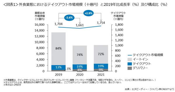 2021年の外食業態テイクアウト市場は、2019年比約3%増の1兆7540億円