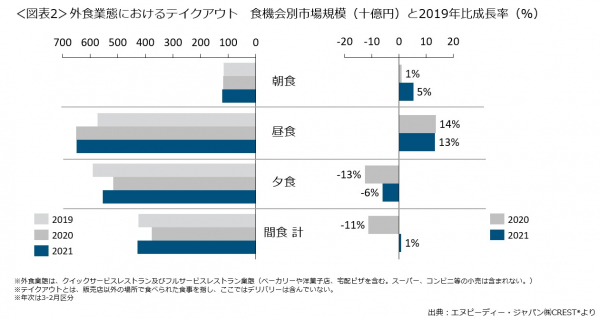 外食業態におけるテイクアウト市場の食機会別の市場規模をみると(図表2左)、2021年で最も大きいのは昼食、次いで夕食でした。2019年比での成長率は(図表2右)、昼食がコロナ禍で大きく伸長し、2021年は13%増でした。一方、夕食は2020年に13%減となった後、2021年は6%減まで回復しました。