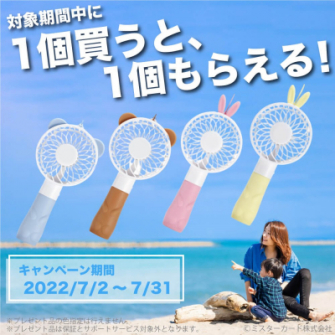 ミスターカード株式会社(埼玉県)が運営するECショップのオールバイで、対象期間中ハンディファン「MINI FAN」をご購入で、「1個買うと、1個もらえる」キャンペーンを2022年7月31日(日)まで開催します。キャンペーン期間中にゲットして、友達や家族と夏を爽やかに過ごしませんか?プレゼント数量無くなり次第、終了となります。