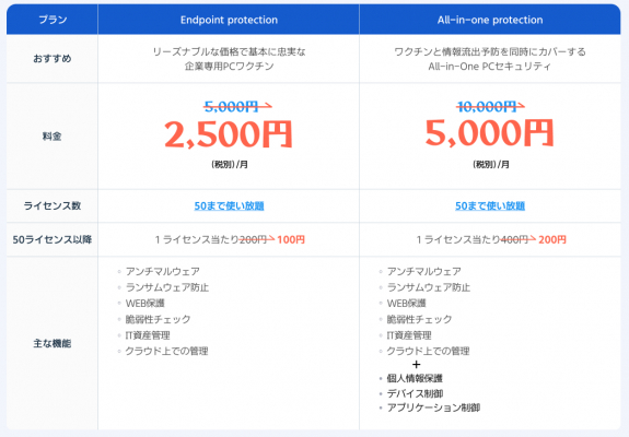 情報システム管理者がいない中小企業様でも簡単に導入や管理ができる管理者ページをクラウド上でご提供しております。また、アンチマルウェア、アンチランサムウェア、ウェブ保護などのアンチウイルス対策機能に加えて、情報漏洩対策機能(個人情報保護、デバイス制御、アプリケーション制御)をプランごとに選び、ご利用いただけるオールインワン・エンドポイントセキュリティ製品です。