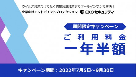 そこで、ウイルス対策と情報漏洩対策がオールインワンで叶い、さまざまなセキュリティリスクから企業を守るEXOセキュリティは、この度、7~9月の3ヶ月間にご利用申込みをしていただいた企業様限定で、1年間のご利用料金半額キャンペーンを実施いたします。