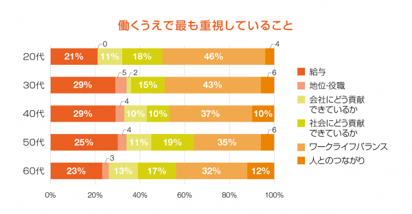 年代別に見ると、20代・30代では「ワークライフバランス」をより重要視する傾向が強く、他の世代を10%ほど上回る結果となりました。