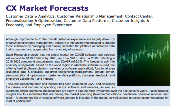 CX Market Forecasts: Customer Data & Analytics, Customer Relationship Management, Contact Center, Personalization & Optimization, Customer Data Platforms, Customer Insights & Feedback, and Employee Experience
