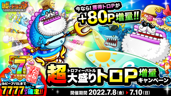 株式会社アソビズム(本社:東京都千代田区、代表取締役:大手智之)は、App Store・Google Playにて好評配信中の『城とドラゴン』で、「トロフィーバトル 超大盛りトロP増量キャンペーン」を2022年7月8日(金)より開催いたします。