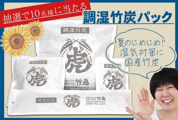 今回プレゼントする調湿竹炭パックは、お部屋の消臭や調湿に活躍する竹炭を不織布の袋に入れた除湿剤。調湿効果をしっかりと発揮しつつも、竹炭粒が外にこぼれることのない不織布で製造するために、こだわり抜いた、アイテムです。梅雨や夏場の湿気とり、調湿にお役立ていただけます。