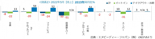 外食・中食市場の2022年5月は、売上7.7%減(2019年同月比)