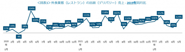 外食業態計(レストラン計)の出前(デリバリー)売上2019年同月比をみると(図表3)、プラス成長が続いています。デリバリー増加のピークは2020年5月の204%増ですが、その後も2ケタ増が続き、特に2021年2月(133%増)、同5月(158%増)、同7月(182%増)が大きく伸びました。2022年4月は49%増で少し成長率が鈍りましたが、2022年5月は、前年同期の156%増よりは下回ったものの、2019年同月比124%増でした。