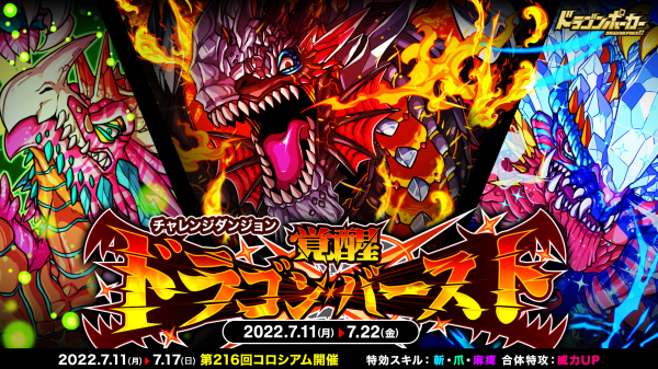 株式会社アソビズム(本社:東京都千代田区、代表取締役:大手智之)は、App Store・Google Playにて好評配信中のリアルタイム合体カードバトル『ドラゴンポーカー』で、2022年7月11日(月)より、復刻チャレンジダンジョン「覚醒ドラゴンバースト」を開催いたします。