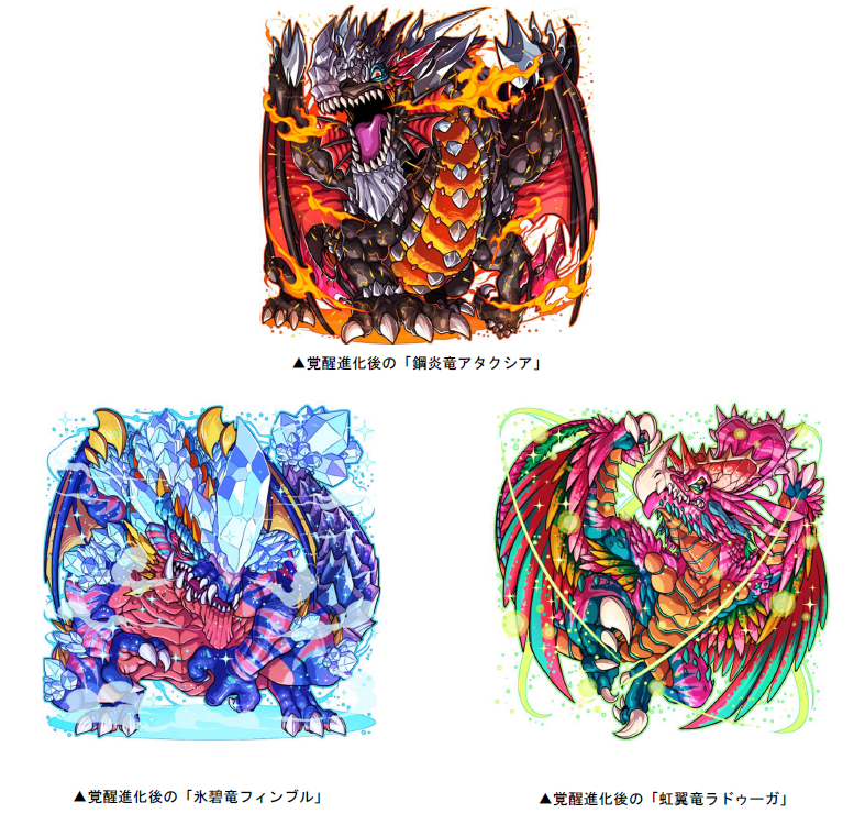 7月11日(月)より、チャレンジダンジョン「覚醒ドラゴンバースト」を復刻開催いたします。本ダンジョンでは、「鋼炎竜アタクシア」「氷碧竜フィンブル」「虹翼竜ラドゥーガ」がボスモンスターとして登場し、プレイヤーの前に立ちはだかります。フレンドと協力して強力なボスを倒し、レアアイテムを手に入れましょう!