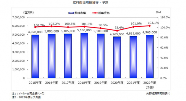 コロナ禍の終息時期は見通せないものの、行動制限も徐々に緩和され、感染対策を徹底して旅行や行事、イベントの開催が可能となってきていることで、2022年度の飲料市場(牛乳・乳飲料を含む)は、前年度比103.1%の4兆9,650億円と2年連続で拡大するものと予測する。