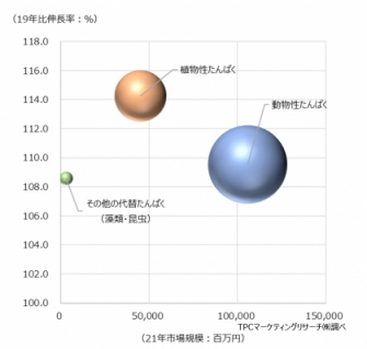 ◆2030年ー2050年頃に到来が予測されている「たんぱく質クライシス」への懸念から、植物性たんぱく素材は、持続可能なたんぱく源として、近年、その需要が高まっている。植物性たんぱく素材市場は、2021年に19年比14.2%増の452.3億円となり、年々、拡大傾向にある。同市場では、品質改良といった従来型の需要に加え、プラントベースフードの拡大に伴い、代替肉・代替乳といった動物原料代替としての需要が増加している。