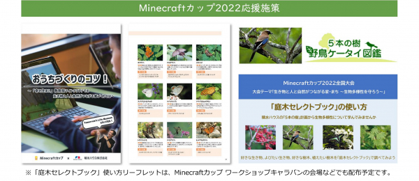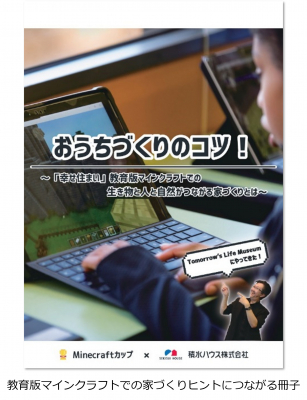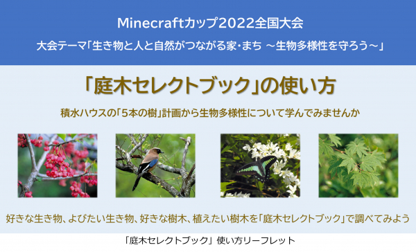 積水ハウスの住宅展示場等で、教育版マインクラフトでの家づくりヒントにつながる冊子を無料配布します。積水ハウスの生物多様性の取り組み「5本の樹」計画や住宅の最新技術など、大会のヒントが詰まった一冊です。