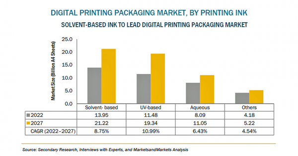 デジタル印刷パッケージングの市場規模は、2022年の294億米ドルからCAGR8.9%で成長し、2027年には451億米ドルに達すると予測されおり、印刷物を短期間で経済的に生産することができるため、市場が拡大しています。オンデマンド印刷は、新しいパッケージングやグラフィックデザインの変更に伴い、未使用の在庫が発生しないよう、無駄を省くのに役立っています。また、インクジェットや電子写真などの印刷技術の発展により、デジタル印刷は最も費用対効果が高く、手軽に利用できる印刷方法の一つとなっています。