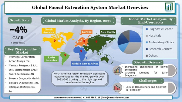 糞便抽出システム市場は2022-2031年の予測期間中に世界中で4%のCAGRを登録することが予測されます。糞便抽出システムは、感染症を診断すると患者の便サンプルを収集するために使用されるデバイスです。炎症性腸疾患、寄生虫感染症、吸収不良症候群などのさまざまな病気は、糞便抽出システムの助けを借りて診断されます。市場の成長は、患者のタイムリーな診断に対する需要の高まり、と人々の健康意識の高まりに起因する可能性があります。