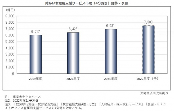 2022年度の障がい者雇用支援サービス市場規模は前年度比8.2%増の7,500億円を予測する。障がい者雇用支援サービスは、多くの企業が段階的に引き上げられる障がい者の法定雇用率に対応ができていないことや、障がい者の数は増加傾向※にあることから、当該サービスの需要は引き続き高まりを示していくものと考える。