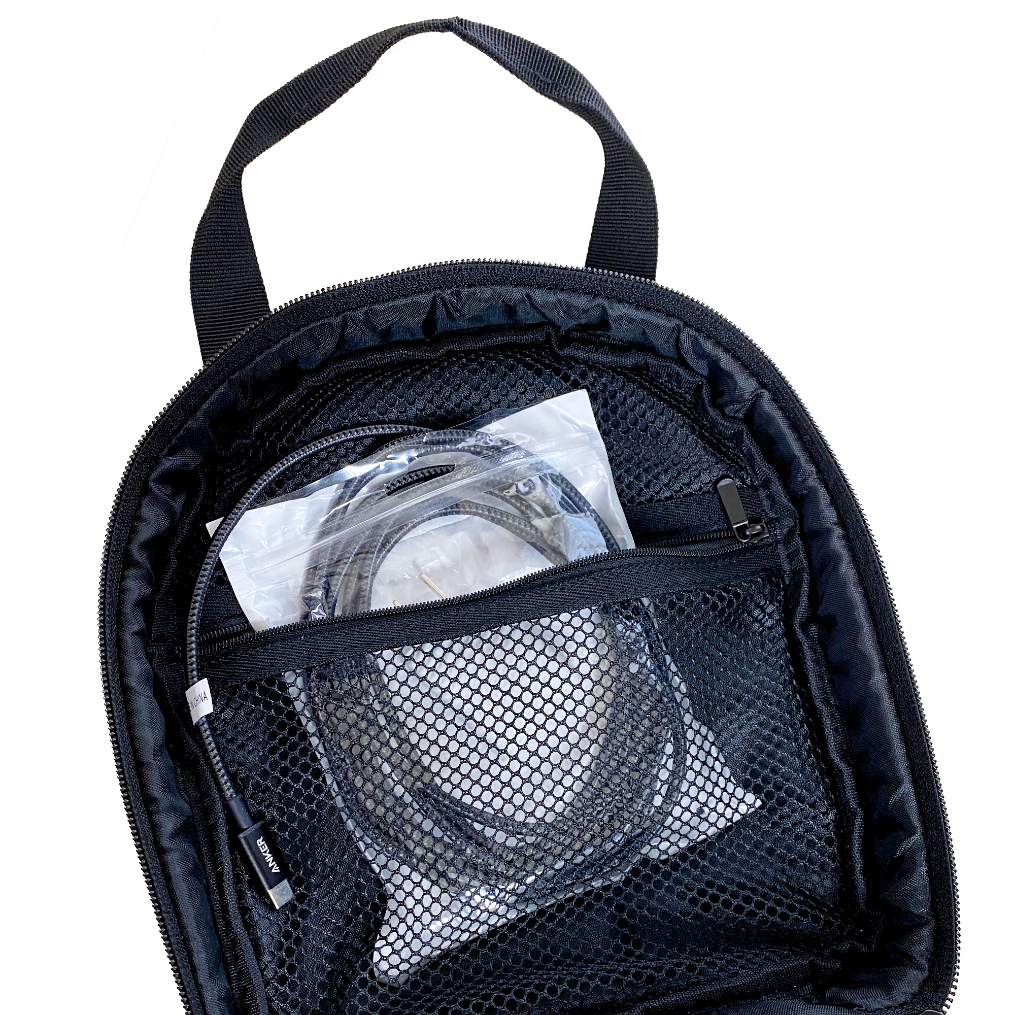 ダイヤルストラップの形状にジャストフィットするポーチで、コントローラーも含めて、アクセサリーも無理なく収まります。内部には中が見えるメッシュ地の大型ポケットがあるため、充電アダプターや、長めのケーブルなども無理なく収納できるのが特長です。