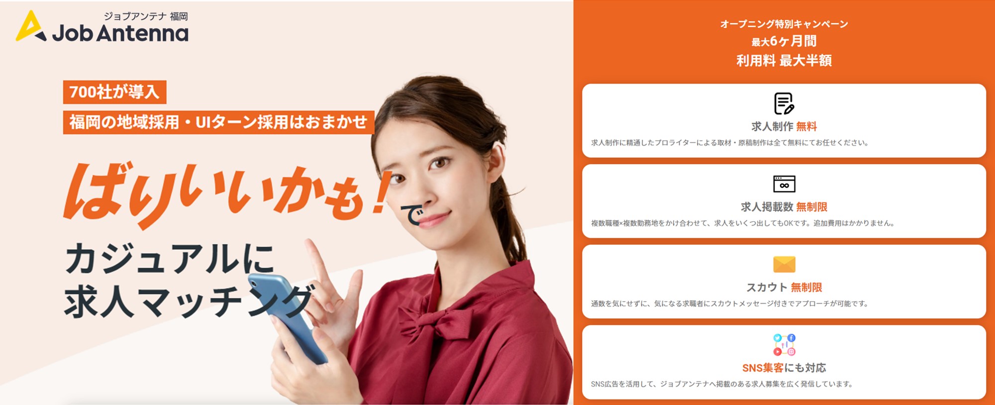 福岡企業向けに6ヶ月間の求人掲載料金が最大半額になる「オープニング特別キャンペーン」も継続して開催しています。対象期間は2022年12月末までの受付となりますので、福岡県に事業所のある企業は「ジョブアンテナ福岡」への申し込みをご検討ください。