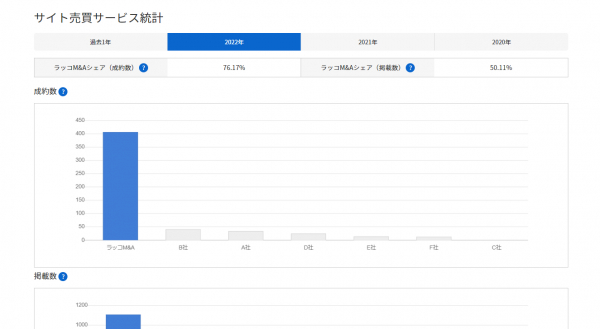 サイト売買サービス統計では、主要なサイト売買サービスの成約数・掲載数とそれらにおけるラッコM&Aのシェアを過去1年または2020年~2021年の各年ごとに見ることができます。