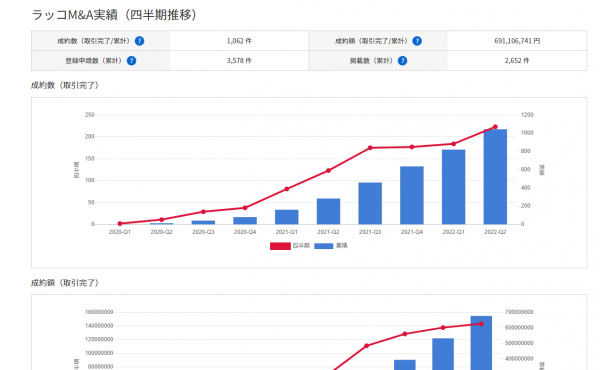 ラッコM&Aの実績データ(成約数・成約額・掲載数・登録数)を累計と四半期推移でご覧いただけます。