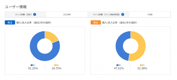 ユーザー情報ではラッコIDユーザー数とラッコM&Aユーザー数、売主及び買主の個人法人比率を公開しています。