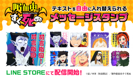 株式会社インクルーズの販売アカウントより初登場のTVアニメ「吸血鬼すぐ死ぬ」のLINEスタンプは、テキストを自由に入れ替えることのできる「メッセージスタンプ」となっております。