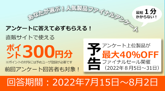 この度弊社では、2022年8月5日(金)から31日(日)にかけて「あなたが選ぶ!人気製品ベスト10ファイナルセール」の開催を予定しております。こちらのセール対象製品を選定するためのアンケートを実施いたします。