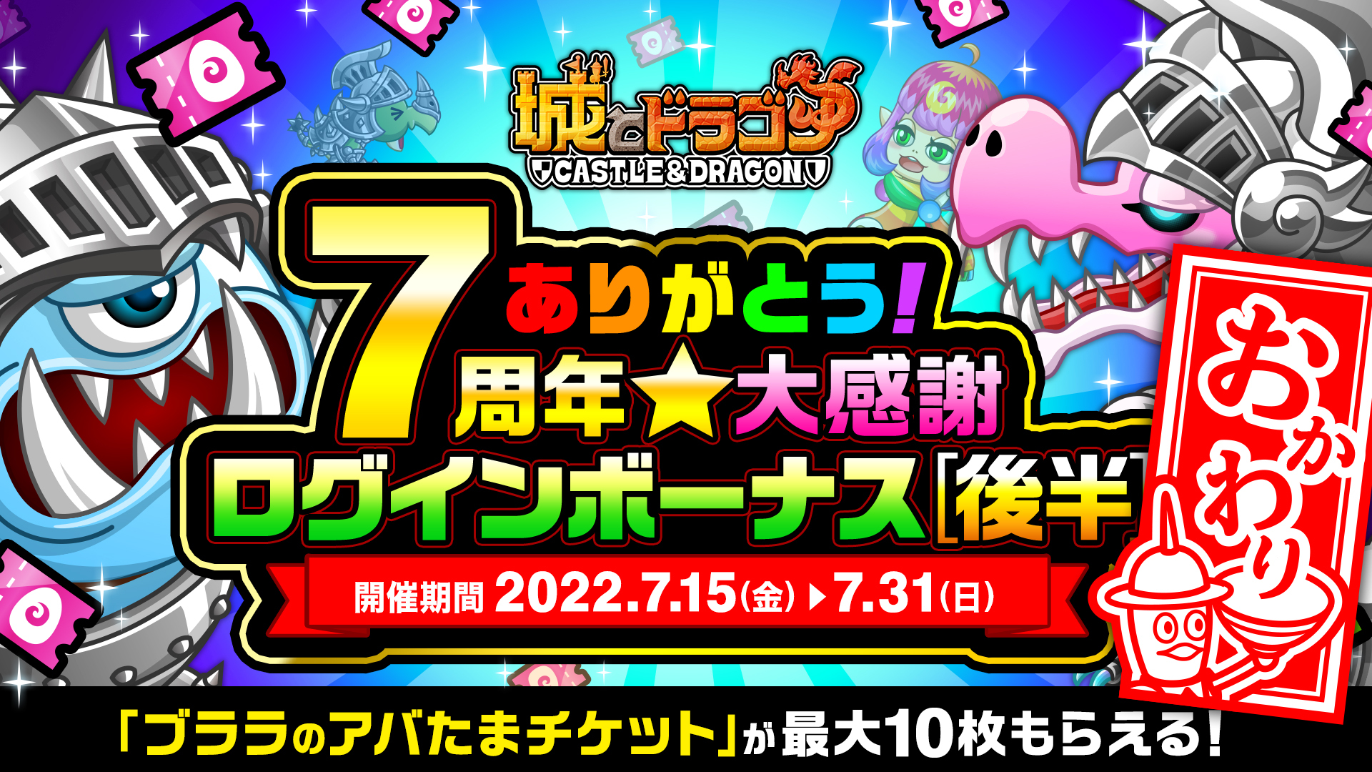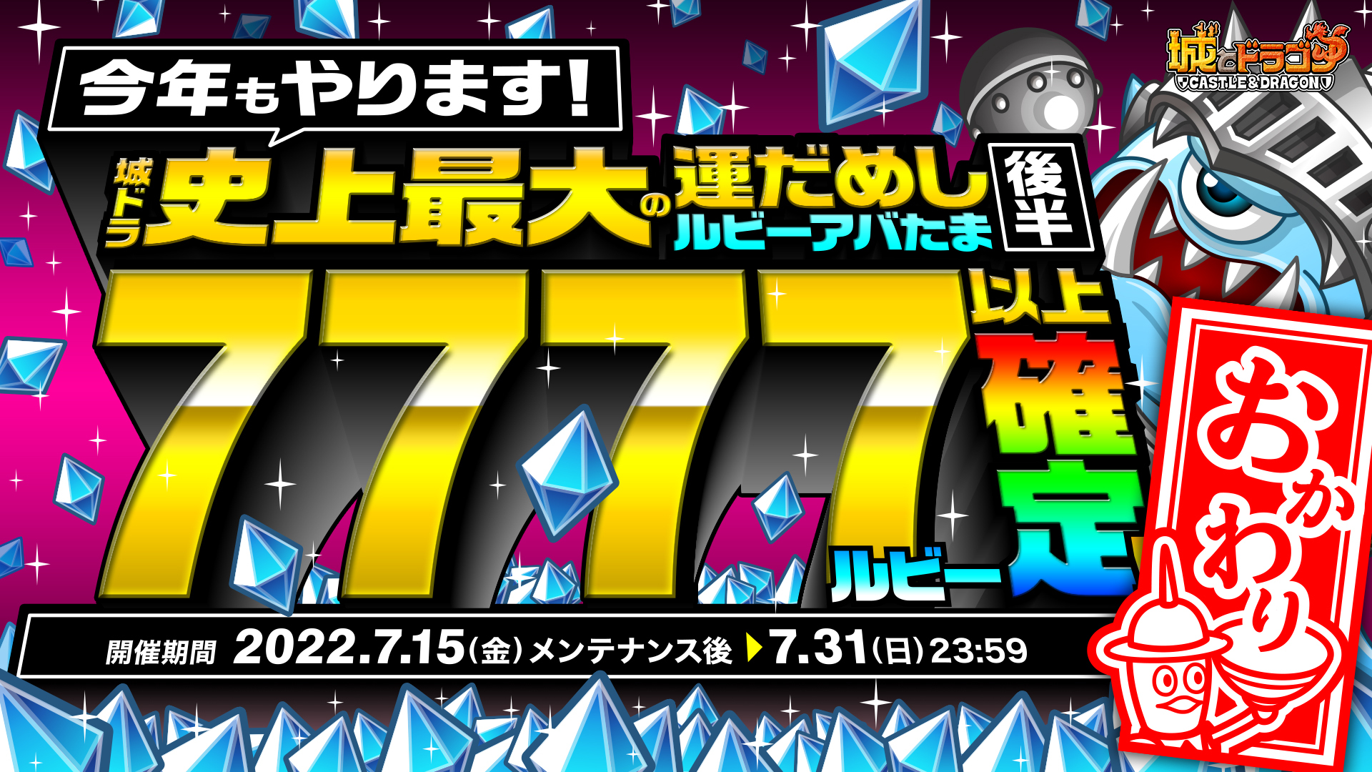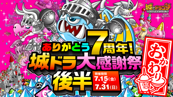 現在開催中の『城とドラゴン』7周年キャンペーン「ありがとう7周年!城ドラ大感謝祭おかわり」。本日7月15日(金)メンテナンス後からはいよいよ “後半”がスタートします。前半に引き続き特別なログインボーナスや、必ず“7777ルビー”以上が当たる「ルビーアバたま」、最高“77777ルビー”と特別なフレームが当たる「大感謝祭!城ドラ宝くじ」などを再び実施!既に前半を楽しんだ方もまだの方も、ぜひ“大感謝祭おかわり“後半をお楽しみください!