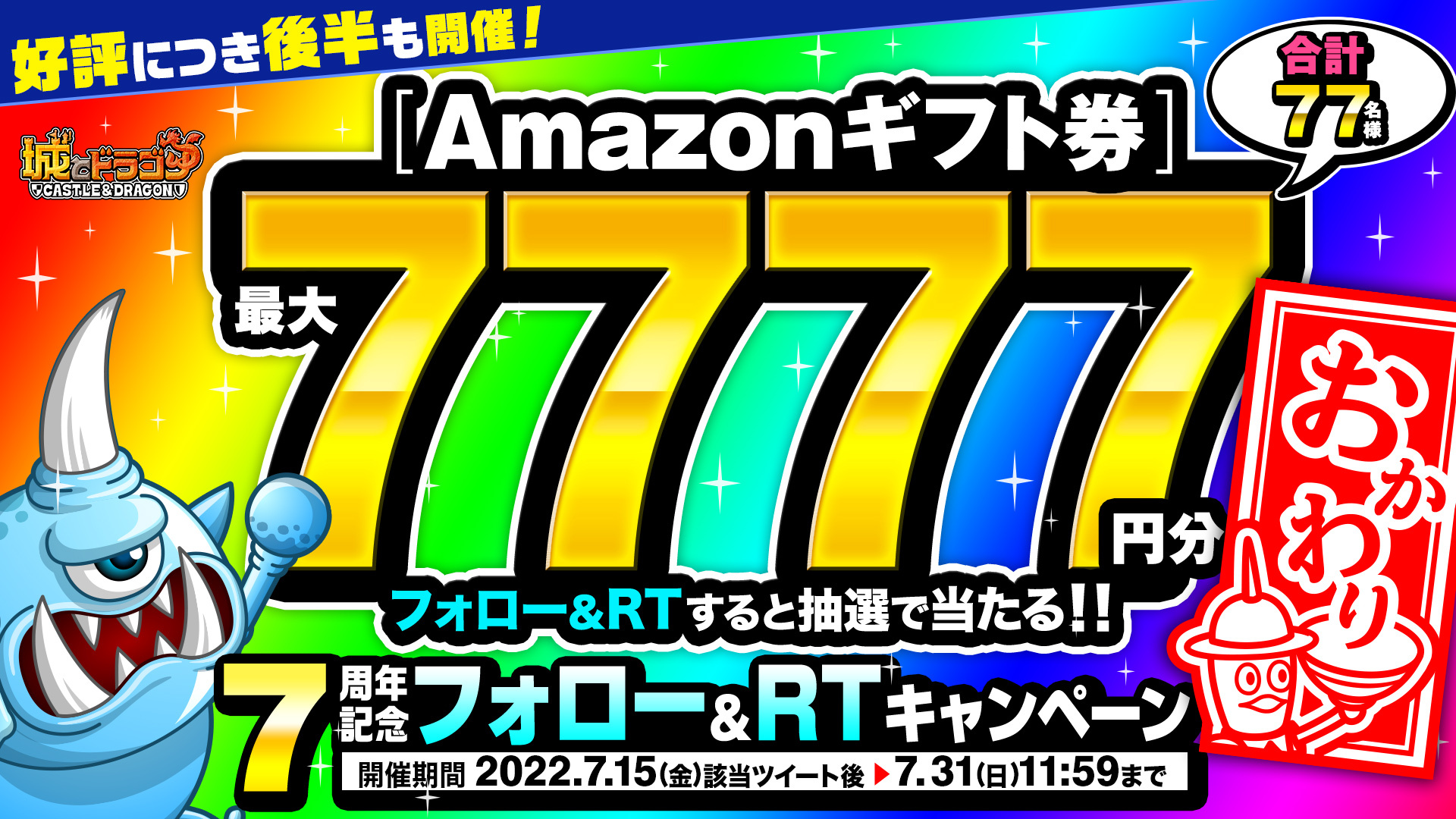 好評につき、7月15日(金)より「7周年おかわりフォロー&RTキャンペーン」を後半も実施いたします。『城とドラゴン』公式Twitterアカウントをフォローし、対象ツイートをリツイートしていただいた方の中から抽選で、Amazonギフト券7,777円分を2名様、500円分を75名様にプレゼントいたします。
