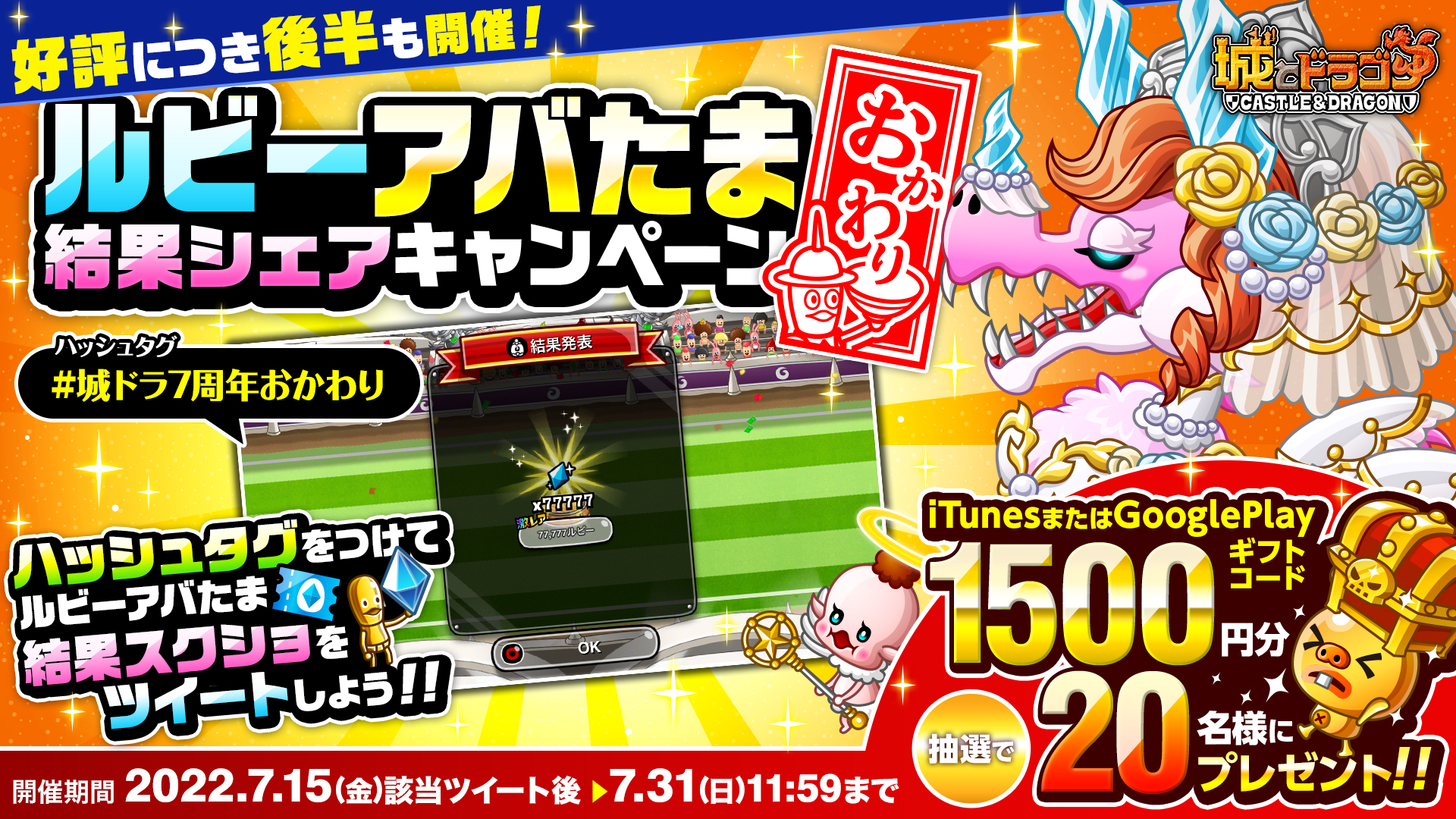 好評につき、7月15日(金)より「ルビーのアバたま結果シェアキャンペーン」をTwitterにて実施いたします。「ルビーのアバたま」結果発表画面のスクリーンショット(動画でも可)とハッシュタグ「#城ドラ7周年おかわり」をつけてツイートをしてくださった方の中から抽選で、1,500円分のギフトカード(iTunesカード/Google Playカード)をプレゼントいたします。
