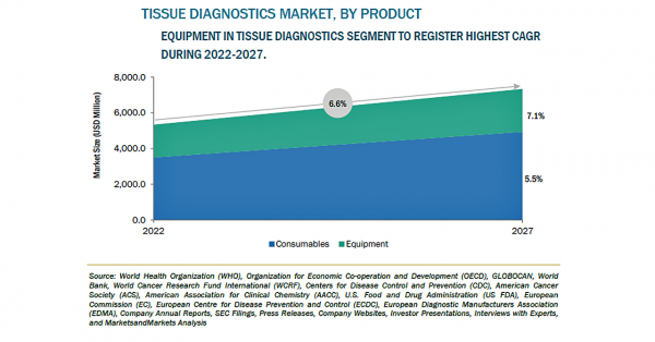 組織診断の市場規模は、2022年の53億米ドルからCAGR 6.6%で成長し、2027年には73億米ドルに達すると予測されています。同市場の成長は、主に腫瘍性疾患の有病率の上昇と腫瘍学的スクリーニングの高い需要によるものです。一方、熟練した専門家の不足は、市場の成長を制限する可能性があります。