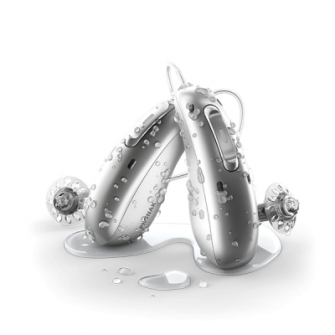 長年補聴器の防水対策を研究してきたソノヴァ社は今回、独自の頑強なハウジングを開発。水や湿気が入り込まないピンレスレシーバ構造に加え、内部回路を保護するパリレンコーティング、ハウジングの継ぎ目を補強するシリコンシーリング、水圧を直接受けない 4箇所のマイクロホン音口、非接触型充電の採用により、従来のフォナック耳かけ型補聴器を上回るウォータープルーフ*を実現しました。その性能は、5年間使用をベースに行った、塩水・プール水を使った浸漬テストと汗テストより証明されています。