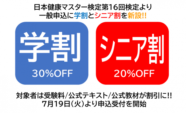 日本健康マスター検定は、さらに多くの人々にヘルスリテラシーを高めていただくために、一般申込に「学割(30%OFF)」と「シニア割(20%OFF)」を第16回検定(申込受付;2022年7月19日~9月9日)より新設しました。