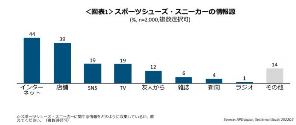 2022年7月に実施した、日本全国16-69才の消費者2000人を対象とした自主調査「センチメント・スタディ」によると、日本人がスポーツシューズ・スニーカーの情報源として最も利用しているのは「インターネット」で44%でした(図表1)。続いて「店舗」が39%と2番目で、この2つが圧倒的に多い結果となりました。