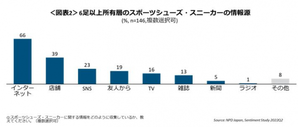 エヌピーディー・ジャパンのスポーツ事業部アカウントマネージャーである、伊藤和正(いとう・かずまさ)は、「今回の調査では日本人がスポーツシューズ・スニーカーについてどこから情報を入手しているのかが明らかになりました。全体の44%、6足以上所有している層の66%が『インターネット』を情報源としており、消費者が自宅などであらかじめ情報収集をしたうえで購入に至っているという購買行動が浮かび上がってきます。また『SNS』はスポーツシューズ・スニーカーを多数所有している層以外の一般層でも高い割合で利用されており、ブランドはSNSをコミュニケーション戦略に組み込む必要があることを示しています。」と話します。