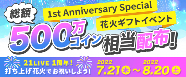 株式会社エムアンドティーティー(本社:沖縄県北谷町、代表取締役:井藤 三知子)が運営するエンターテイメント・ライブ配信サービス【21LIVE(ニーイチライブ)】URL: https://21.live では7月21日(木)から8月20日(土)まで、1周年記念ギフト・打ち上げ花火の獲得数および使用数を競うランキングイベントを開催いたします。