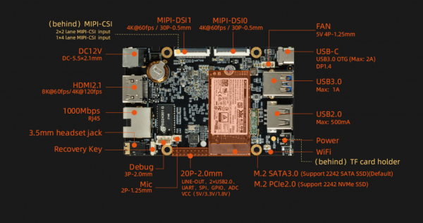 RK3588Sプロセッサは、フル機能のRockchip RK3588同様、Cortex-A76 / A55プロセッサ、Arm Mali-G610 GPU、および/または6 TOPS AIアクセラレータの高性能を活用したスマートスペックです。。RK3588Sプロセッサは、RK3588に搭載されている4レーンPCIe 3.0なしでは高速NVMeストレージを必要とする人々の要件を満たさない可能性がありますが、代わりにボードは最大5GbpsのPCIe 2.0/2.1インターフェイスにフォールバックしております。