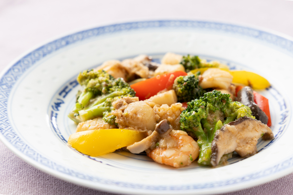 鹿児島沖で獲れたヒゲナガエビ、青森県陸奥湾産のホタテ貝、三陸沖で水揚げしたムラサキイカを使った西尾シェフ特製の「海鮮XO醤炒め」です。海鮮と野菜を最上級調味料XO醤を使って強火で炒め、深みある香りと味わいに仕上げました。冷たく冷えたビールにも、ほかほかの白い炊きたてごはんにも相性抜群。お好きな組み合わせでお楽しみください。