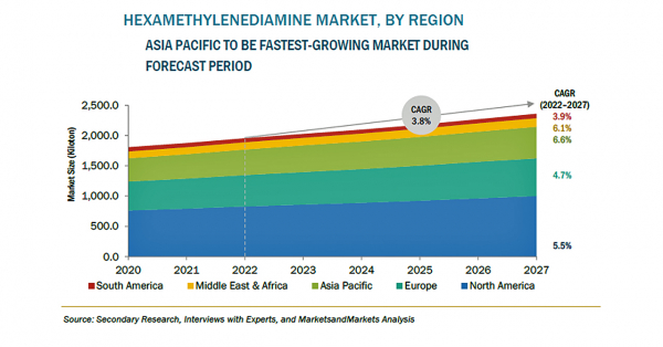 ヘキサメチレンジアミンの市場規模は、2022年の89億米ドルからCAGR5.4%で成長し、2027年には116億米ドルに達すると予測されています。ヘキサメチレンジアミンは、腐食防止剤、化学中間体、硬化剤であり、繊維、水処理、自動車など、さまざまな最終用途産業で使われ、塗料や接着剤に使用される樹脂の生産にも使用されています。市場は、繊維産業や自動車産業における市場製品の需要増加により拡大しています。これは、ナイロン6-6の製造における前駆体として、ヘキサメチレンジアミンの需要が高まっていることに起因しています。この材料は、家庭用繊維と技術用繊維の両方の製造に使用されます。
