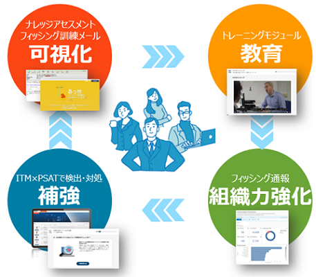 企業が従業員に対するセキュリティ教育に割ける時間は年間2時間といわれており、限られた時間の中で、有効なトレーニングをいかに実施するかが重要です。PSATは、セキュリティインシデント未然防止の取り組みとして、知識評価と訓練メールによって従業員の知識レベルを可視化し、個人のレベルに応じたトレーニングをピンポイントで提供します。また、組織固有のリスクに対策を施すことで従業員の戦力を強化し、サイバー攻撃に対する防御力を向上させます。