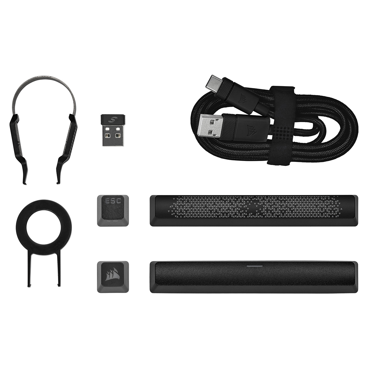 摩耗や退色に強いPBTダブルショットによるキーキャップで、長期間の使用でも安心です。また、スペースバー用のキーキャップはRGBライティングが映えるラディアントバーとスタンダードの2種類が付属し、好みに合わせて変更できます。キーキャップ交換に使用するキーキャッププラーの他、CHERRY MX互換の3ピンキースイッチへの交換に使用するキースイッチプラーも付属し、自分だけのキーボードへとカスタマイズすることも可能です。