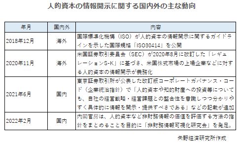 人材活用に関する取組み状況を把握したいという投資家の意向を中心に、国内外で人的資本(人間のもつ能力を資本として捉える考え方)への関心が高まっており、人的資本の情報開示に向けた動きが活発化している。