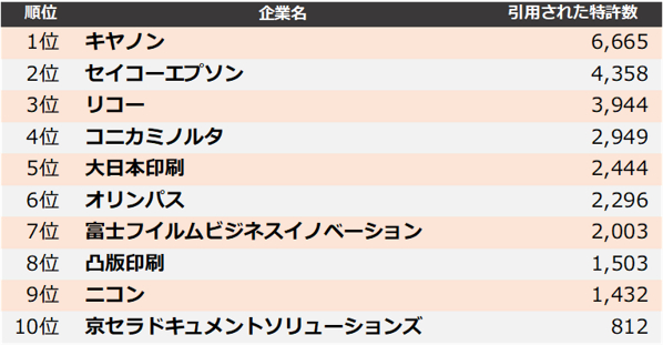 集計の結果、2021年に最も引用された企業は、1位 キヤノン、2位 セイコーエプソン、3位 リコーとなりました。