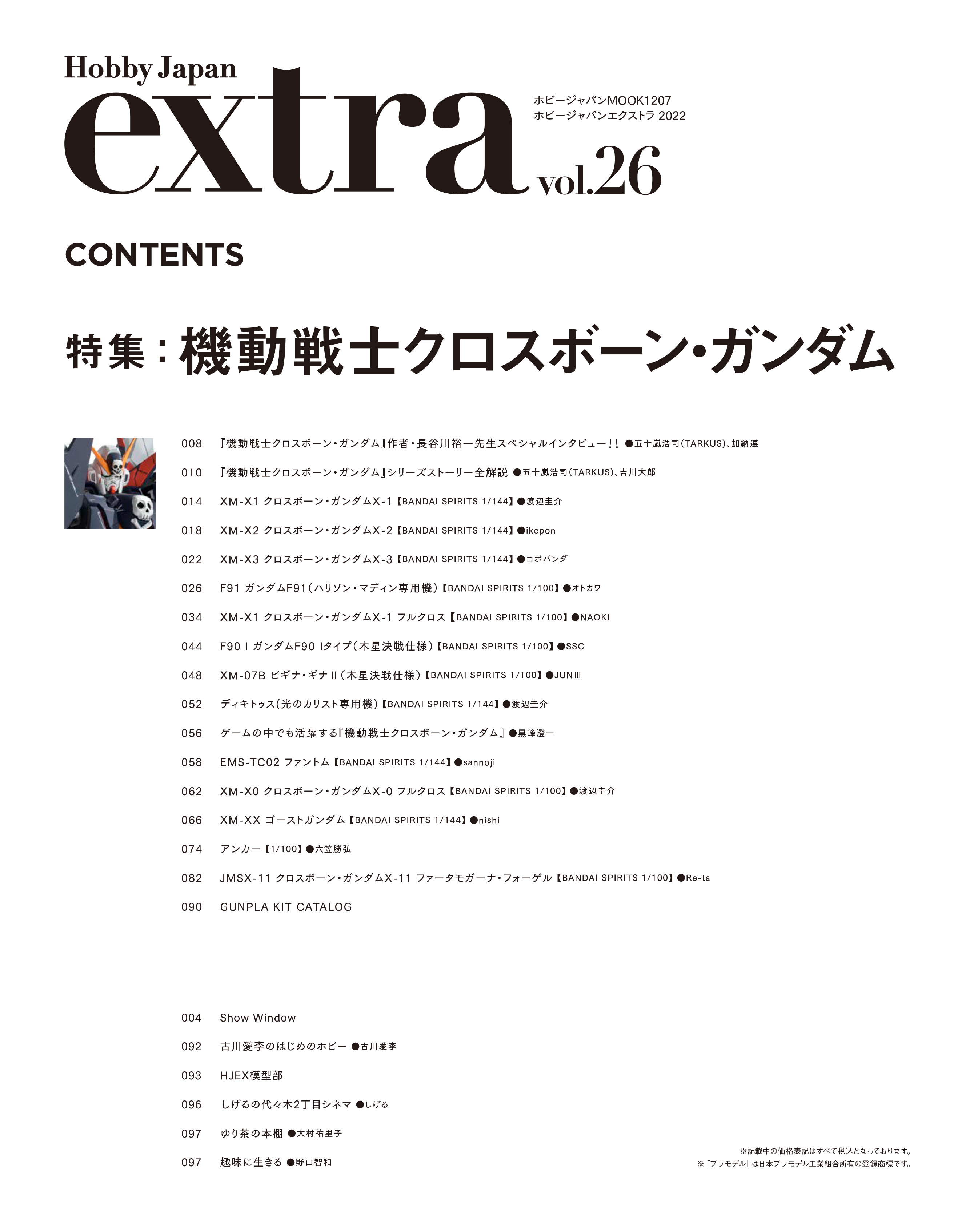 『機動戦士クロスボーン・ガンダム』『スカルハート』『鋼鉄の7人』『ゴースト』『DUST』から最新作の『X-11』を含めた6タイトルを紹介するとともに、各タイトルの主要MSのガンプラ作例を一挙掲載いたします。また、ガンプラではまだ未発売の「アンカー」と「クロスボーン・ガンダムX-11」は1/100スケールでお届け!さらに、本シリーズを手掛けてきた長谷川裕一氏のスペシャルインタビューも掲載いたします。