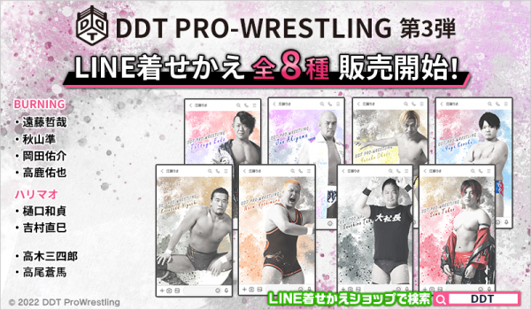 株式会社インクルーズ(東京都渋谷区、代表取締役社長 山﨑 健司)は、LINE株式会社(東京都新宿区、代表取締役社長 出澤 剛)が運営するコミュニケーションアプリ「LINE」内のLINE着せかえにて、「DDTプロレスリング」のLINE着せかえ8点を2022年7月29日(金)に販売開始致しました。