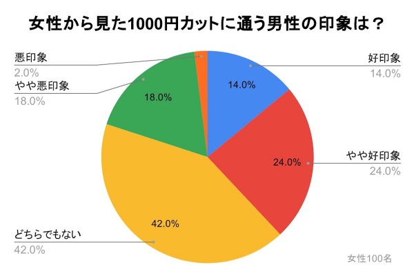 「女性から見た1000円カットに通う男性の印象は?」の質問では、『好印象』が14%、『やや好印象』が24%、『どちらでもない』が42%、『やや悪印象』が18%、『悪印象』が2%という結果となり、38%が好印象と、悪印象の20%を上回る結果となりました。
