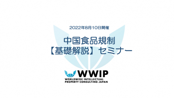 株式会社ワールドワイド・アイピー・コンサルティングジャパン (以下「WWIP」 : 東京都港区) は、2022年8月10日(水)13:30~15:00に、「中国食品規制【基礎解説】セミナー」を開催いたします。