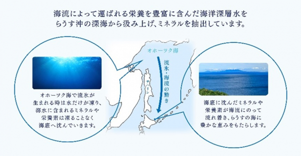 当社では、どこでも同じ最高品質の製品水を造るため、地下水の溶解成分を徹底的に除去する“W逆浸透膜”で精製した「超純粋水」に世界自然遺産知床らうす「深海ミネラル」をブレンドします。“W逆浸透膜”とは、他社の宅配水は逆浸透膜(RO膜)での「ろ過」1回の純水を提供していますが、当社では、逆浸透膜のろ過を2回行い、さらに純水装置を通すことで、純水の質がさらに高い「超純粋水」を精製しています。限りなく不純物ゼロの水を造るため、さらに高度な水処理を行います。また、配合するミネラルは人工ミネラルではなく、天然ミネラル(知床らうす深海ミネラル)を使用しています。