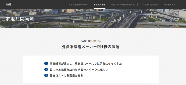 本ページでは、R社様の事業規模拡大に伴う倉庫スペースの確保や配送コストダウンといった課題に対し、当社の家電物流プラットフォームをご提案させていただいた事例を紹介しています。